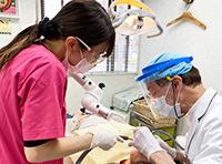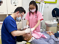 医師の治療機材の用意などアシスタント的仕事から、患者さんの歯のクリーニング、医師の治療後の歯に薬を塗るなど色々あります。医者の診療ペースを崩さないよう、常に術前準備を怠らない、又、術後に対しても患者さんに気をつかう、非常に重要な役割をしています。